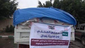 سير اليوم أبناء مديرية بعدان بمحافظة اب قافلة غذائية دعما لأسر المرابطين في جبهات العزة والشرف تسلمتها مؤسسة يمن ثبات .