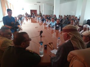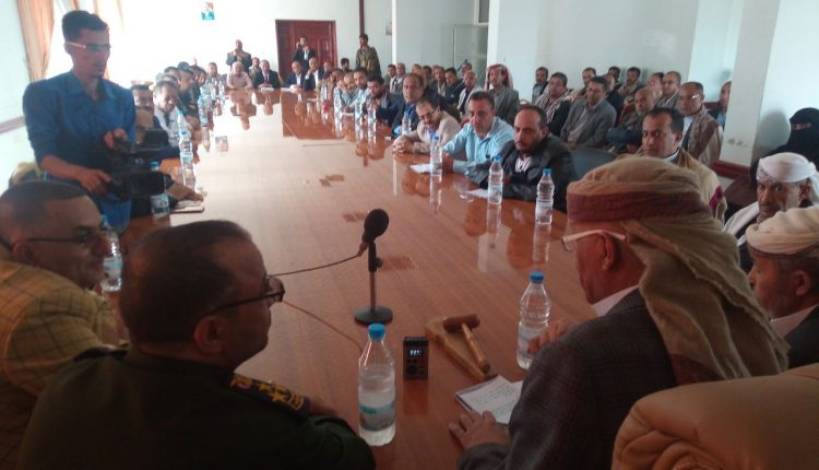 واستعرض الاجتماع بحضور أمين عام المجلس المحلي أمين الورافي ووكلاء المحافظة ، الوضع الأمني والدور الذي يجب أن يضطلع به الجميع لاستتباب الأمن والاستقرار ومكافحة الجريمة والحفاظ على وحدة الصف والجبهة الداخلية والحشد للجبهات لمواجهة العدوان .