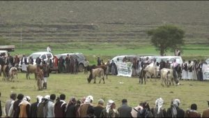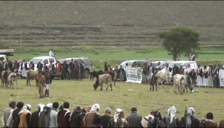 سير أبناء عزلة رعين الداخلة بمديرية يريم محافظة إب قافلة غذائية تحوي أكثر من ٢٠ رأس من الأبقار و١٠٠ كيس دقيق و١٠٠ كيس رز و١٠٠ كيس بطاط ، دعما وإسنادا لأبطال الجيش واللجان الشعبية في جبهات العزة والشرف .