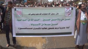 وجدد المشاركون في بيان المسيرة الحاشدة العهد والولاء لتلك المبادئ التي خرج على أساسها ومن أجلها ولها الإمام الحسين نصرة لدين الله والتصدي لطغاة العصر الذين يشنون عدوانا حاقدا وجرائم يومية وحصارا خانقا على هذا الشعب الكريم .