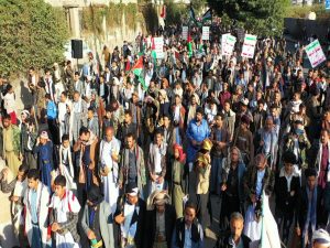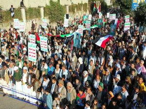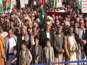 فيما أكد بيان المسيرة تمسك المشاركين وكافة احرار الشعب اليمني بالمضامين والرسائل والمواقف الصادقة والمشرف التي اطلقها السيد القائد عبدالملك بد ر الد ين الحو ثي في خطابه الأخير الأربعاء الماضي .. مجددا مطالبته لكافة دول الجوار لفتح معابر وممرات لدخول المجاهدين اليمنين الى فلسطين للمشاركة الفعلية والجهاد جنبا إلى جنب مع إخواننا الفلسطينيين ..