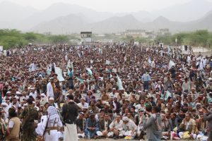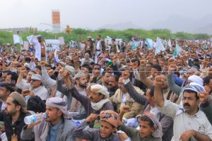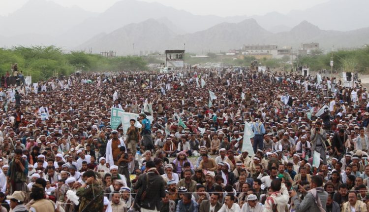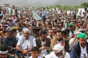 وأهابت الحشود، بأبناء الشعب اليمني، الاستعداد والجهوزية الكاملة للاستنفار الأكبر لمواجهة العدوان الأمريكي البريطاني والتضحية في سبيل عزة اليمن والمبادئ التي يناضل من أجلها اليمنيون للخروج من الوصاية الأمريكية والانتصار للقضية الفلسطينية.