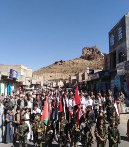 إلى ذلك شهدت مديريات المربع الشمالي “يريم، السدة، النادرة، والرضمة” اثنى عشرة مسيرة ، تميزت جميعها بحضور رسمي وشعبي واسع ، جدّد المشاركون في المسيرات، التأكيد على دعم حقوق الشعب الفلسطيني في إقامة الدولة المستقلة وعاصمتها القدس الشريف، مشيرين إلى أن هذه الحقوق، مشروعة لا يمكن التنازل عنها، وأي تهاون في هذا الأمر هو خيانة للشهداء.