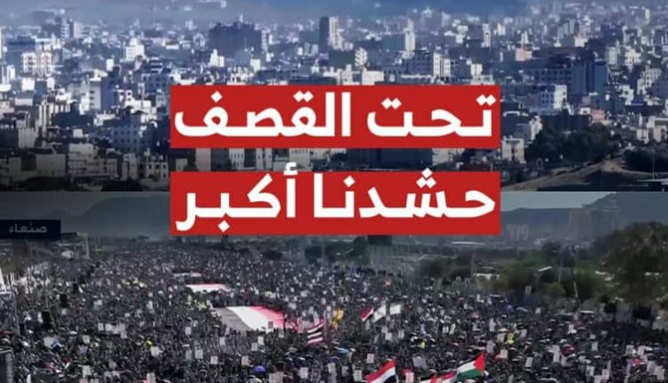 سلاح الجو الامريكي البريطاني الصهيوني ينفذ سلسله من الغارات الجويه في محيط ميدان السبعين قريب من الحشود المليونية المناصرين لغزة كان يتوقع الامريكان والصهاينه ان القصف بجانب المسيرة المليونية سوف يفرق للمتضاهرين بعد القصف الجوي على العاصمة السياسية صنعاء توافد الشعب اليمني للانظمام الى المسيرة المليونية متحدين امريكاء والكيان الصهيوني وبريطانيا اي شعب هذا يا شعب اليمني اذهلتم العالم بصمودكم وشجاعتكم امام قوى الاستكبار العالمي وخرج سريع من المسيرة المليونية يلقي بيان عسكري هام باستهداف القوة الصاروخية حاملات الطائرات الامريكية عندما يتم ضرب الكيان الصهيوني الملايين من الصهاينه يهربو الملاجئ والشعب اليمني يتم قصفه وهو يهتف ما نيالي ما نبالي اشعلوها حرب كبرى عالمية والجميع يصرخ في وجه قوى الاستكبار العالمي عبر التاريخ القديم والمعاصر والحديث لم نسمع او نقراء ان شعب اليمن هزم معروف تاريخيا ان اليمن سحق اكبر امبراطويات العالم من غزاء اليمن لا يرجع الا في تابوت لذلك على الكيان الصهيوني والادارة الامريكية ليس معهم غير خيار واحد هو وقف العدوان على غزة ودخول المساعدات من اجل ايقاف الضربات الصاروخية على اسرائيل وعلى البحر الاحمر لان اي تصعيد من قبل قوى الاستكبار العالمي سيواجه التصعيد بالتصعيد وبالتالي سيجر المنطقة والعالم الى حرب كبرى شاملة سوف يستهدف المصالح الامريكية في الخليج وانهاء التواجد الامريكي في الخليج واغلاق مضيق باب المندب إغلاق كلي وفرض حصار على العالم وبالتالي سوف يتضرر العالم باسرة وسقوط مدوي لكل الانظمة المطبعة وزوال الكيان اللقيط واعلان النصر لفلسطين ولكل دول المحور الذي يمثلو معسكر الحق تمهيدا لاقامة دولة العدل الالهي يعم السلام العالم اجمع